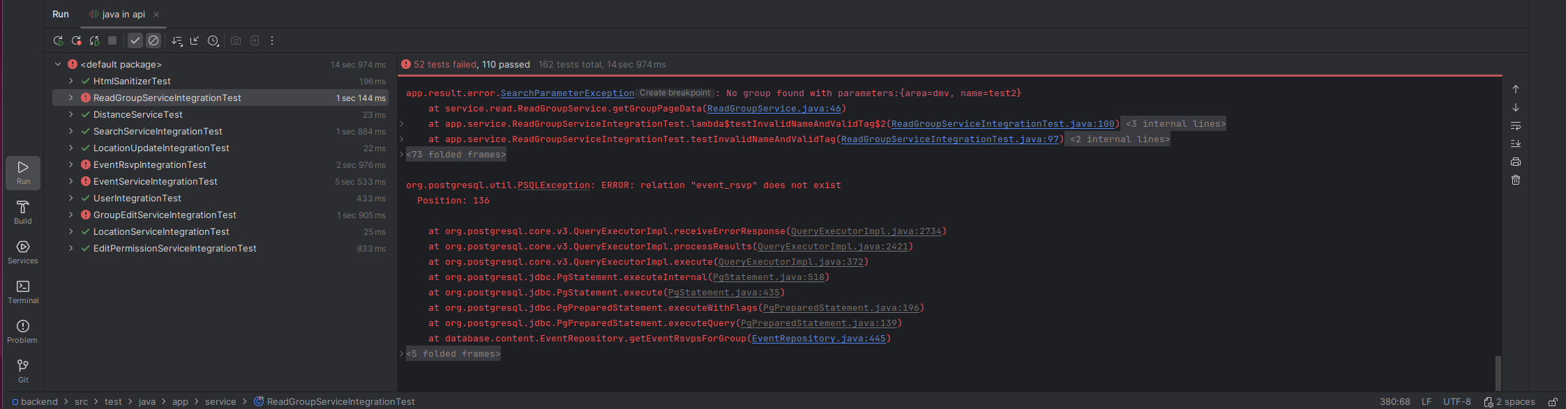 To simplify the code and the database, I decided to combine event rsvp and event editor permissions into one table. After updating the schema on my local environment, I ran the integration tests, which unsurprisingly had test failures. Within approximately 15 seconds, the test results identified which areas of the code needed to be updated. This will be especially useful for developers who haven’t been closely working with the codebase for months.