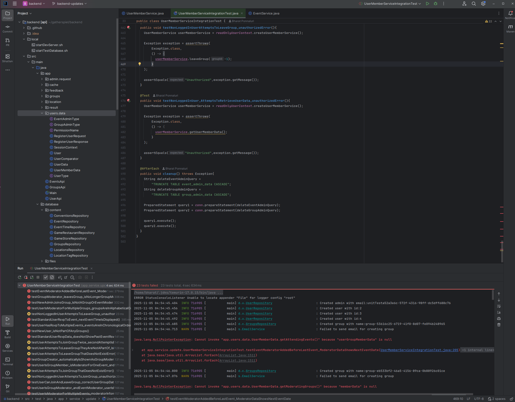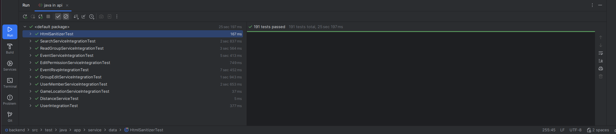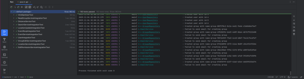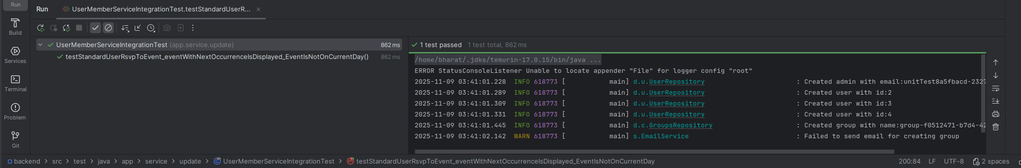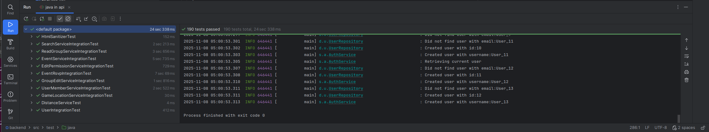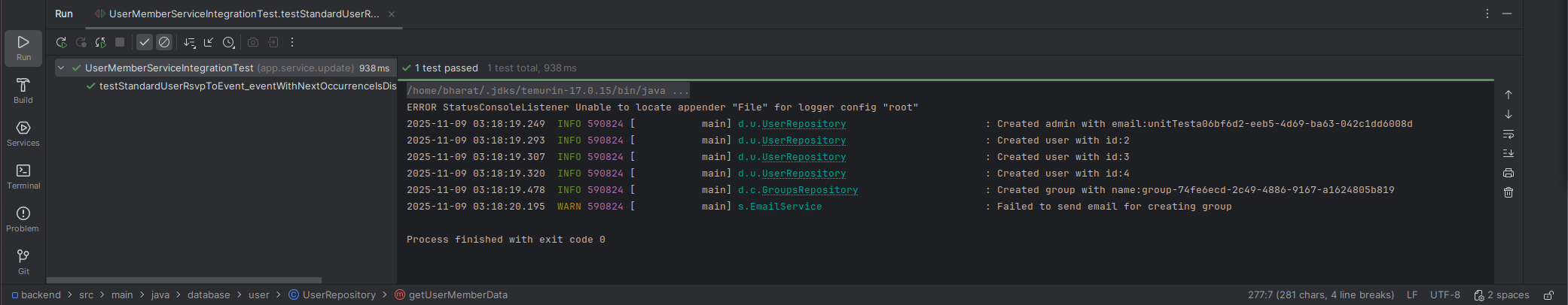 • In the service layer, for the joinGroup and leaveGroup functions, I pass in a user object to the UserRepository instance which runs a database query. Although only the user id is necessary, I decide to pass the whole user object to avoid parameter confusion with the group id which is also an integer.
