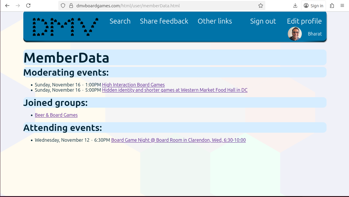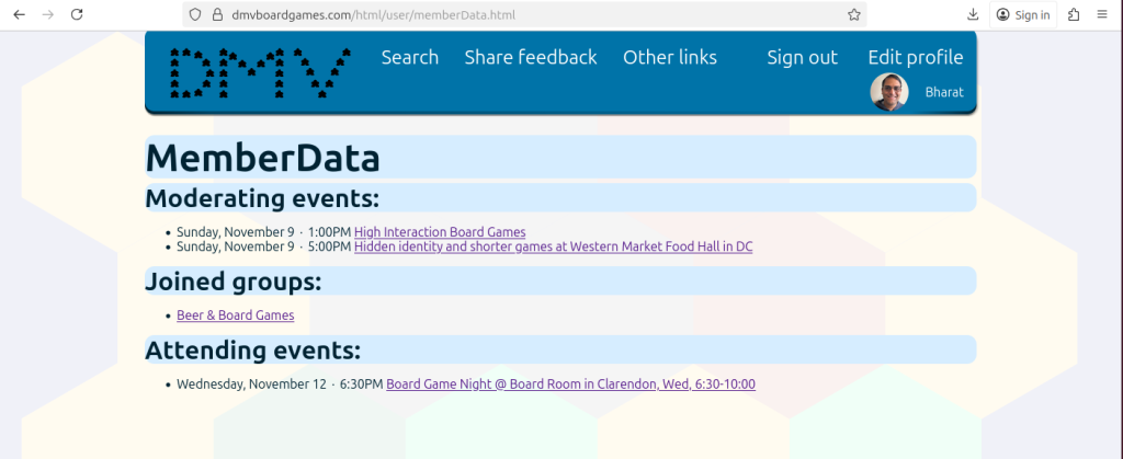 On the morning of Sunday, November 9th, 2025, I deployed an update to dmvboardgames.com to show information about groups a user joined and dates of recurring events that a user had an RSVP to attend.